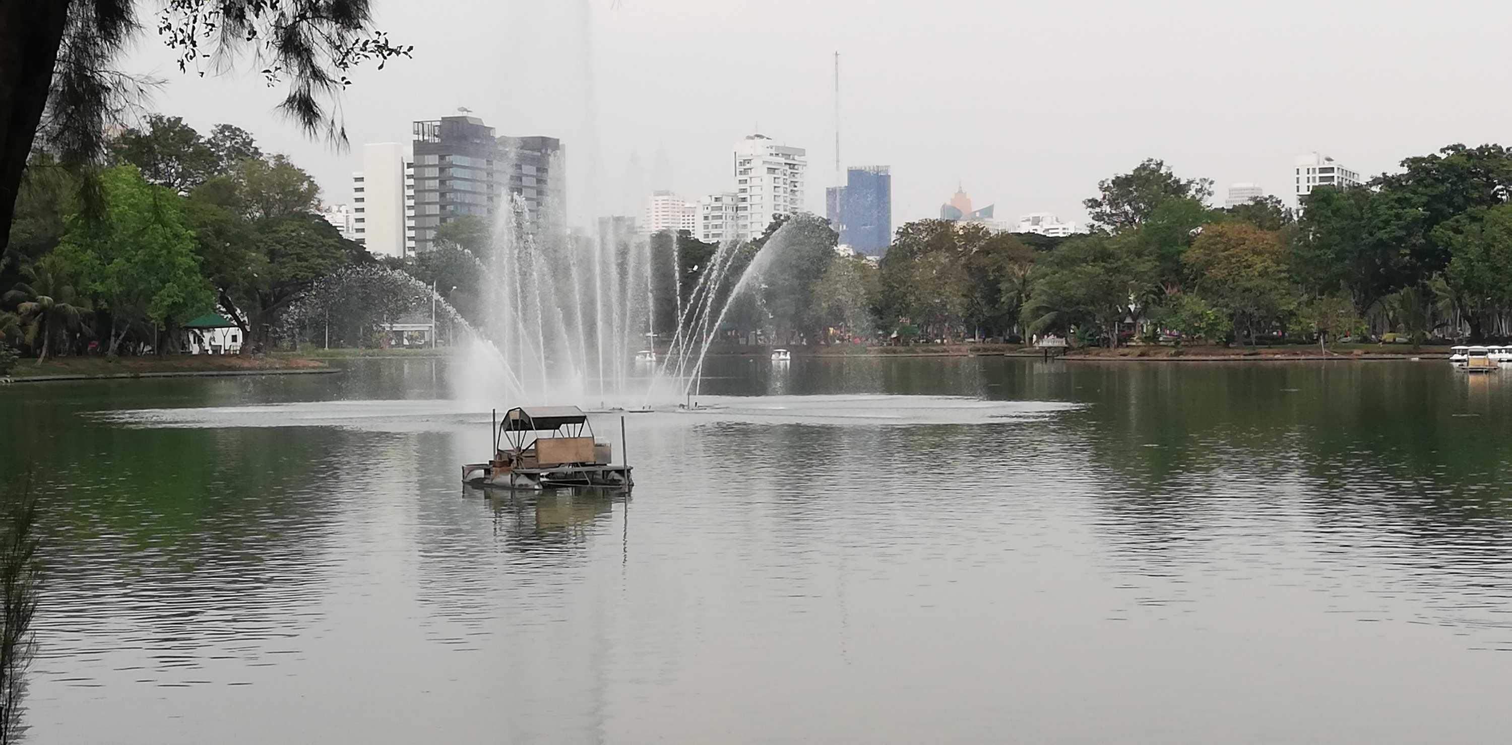 Ausruhen im Lumphinipark. Das seltsame Gerät auf dem See, das ein eigenes Denkmal hat, wurde von König Bhumibol entwickelt, um die Wasserqualität zu verbessern.