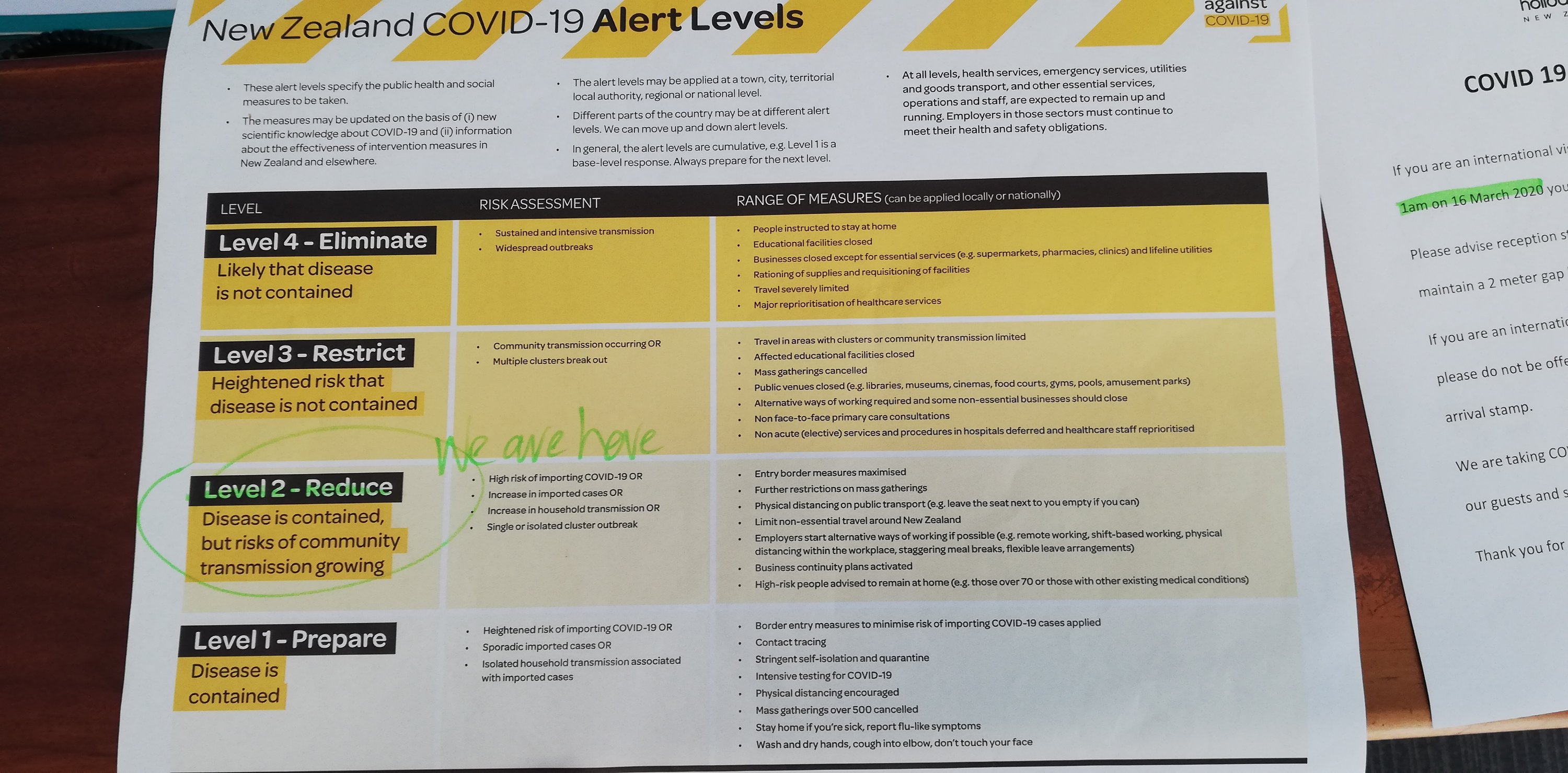 Jetzt ist es auch in Neuseeland soweit: Wir kämpfen gegen das Virus. Seit gestern sind wir auf dem Level 3 und ab Mittwoch Nacht wird Level 4 gelten.
