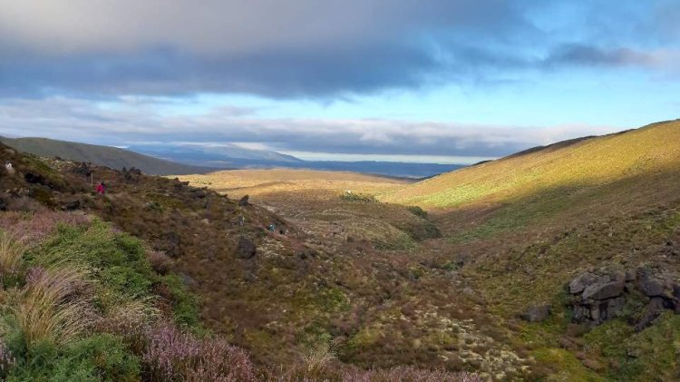 Es geht nochmal kurz hoch zum Blauen See ❻ von dort folgt ein sehr langer Abstieg bis zum Kethetahi Rastplatz❼. Früher stand hier noch eine Alphütte, die aber beim Ausbruch vom Te Maari Kraters 2012 von Felsbrocken getroffen wurde und später ganz abgebrochen wurde. Weiter geht es Richtung Wald. Der Abstieg zieht sich in die Länge, wir merken jetzt, dass dass Ziel viel tiefer liegt, als der Start unserer Wanderung. Während der letzten Stunde ist das Gelände wieder recht flach und wir wandern im Wald entlang eines Baches bis zum Kethetahi Parkplatz❽, wo wir eine halbe Stunde später wieder vom Shuttlebus abgeholt und zum Campingplatz gebracht werden.