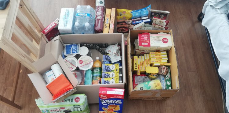 우리 배 고프지 않으니까 마포구청이 아량있게 음식을 많이 보냈어요. 하루에 두번 앱에서 자가진단 해야 해요. 그것 하려고 체온계 받았어요. 이런 종이 체온계는 제가 처음 봤어요.