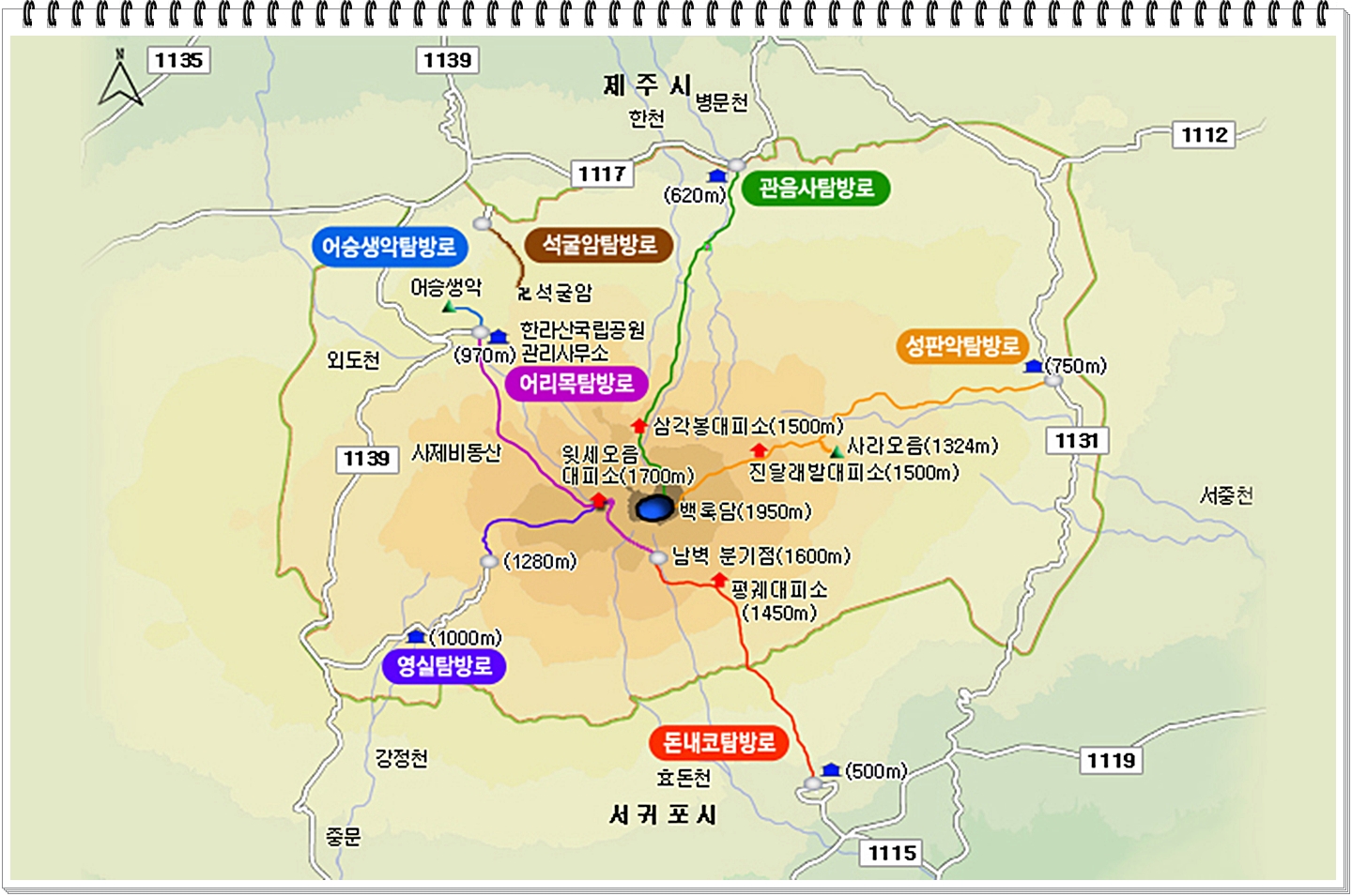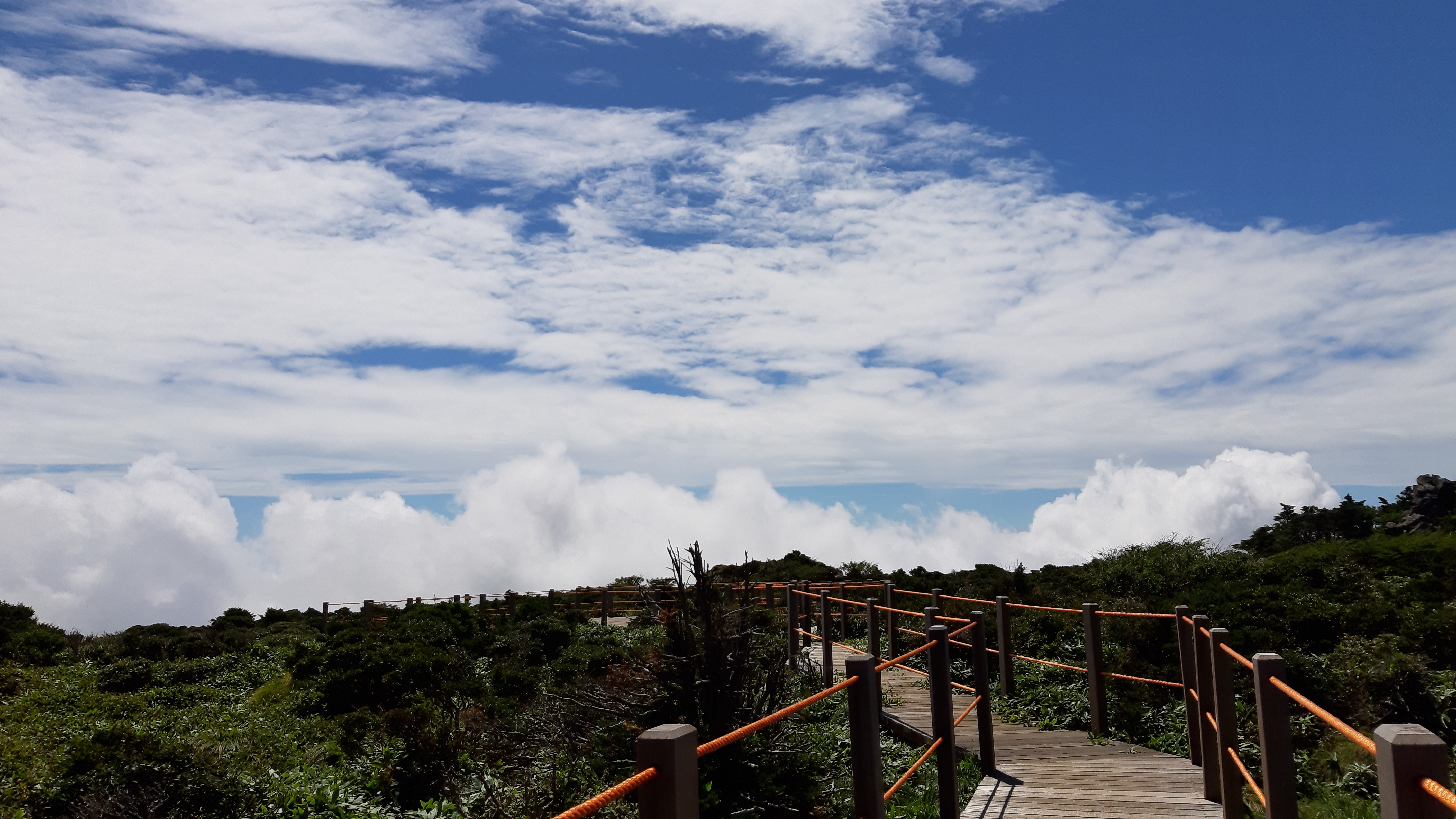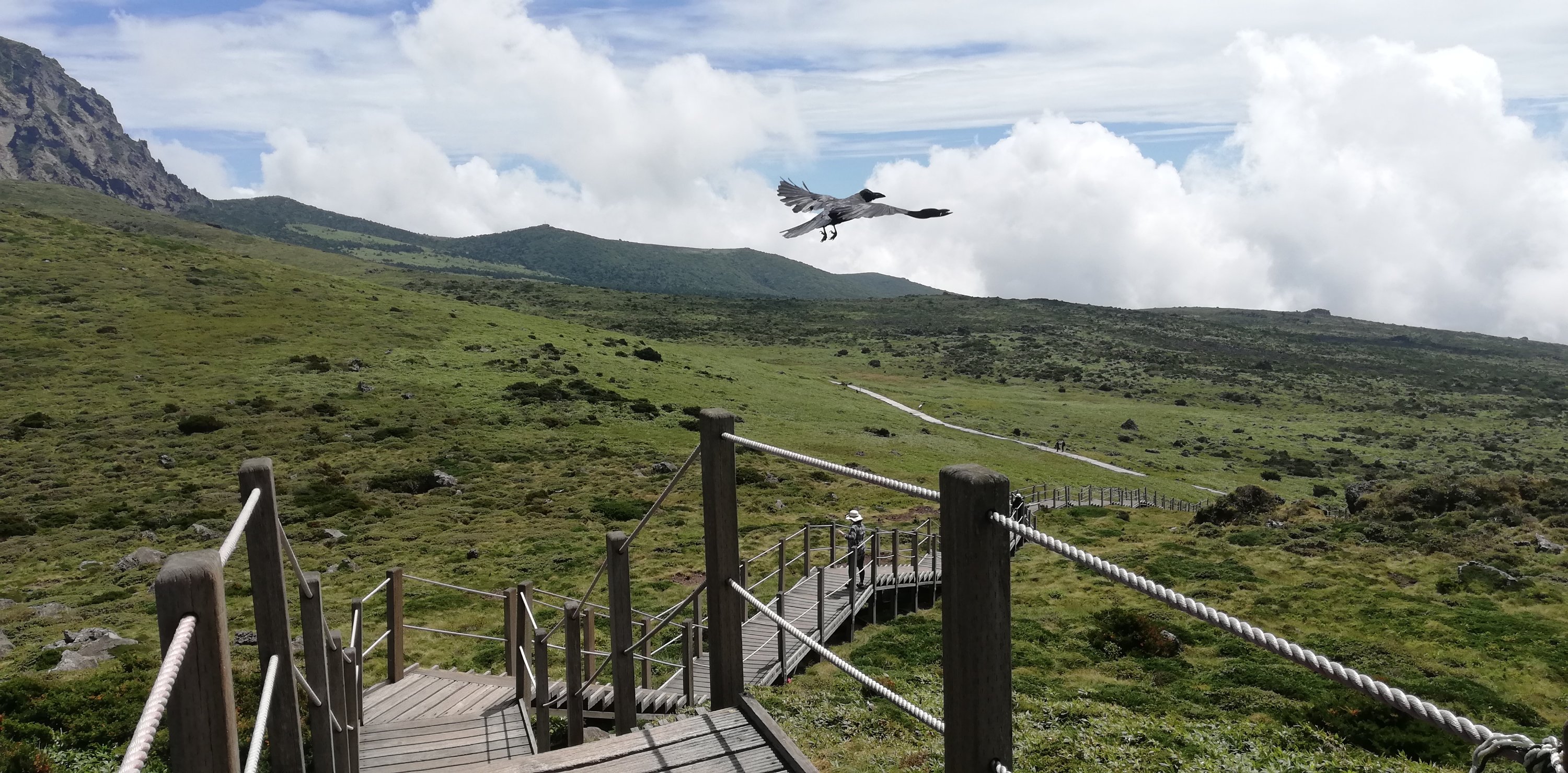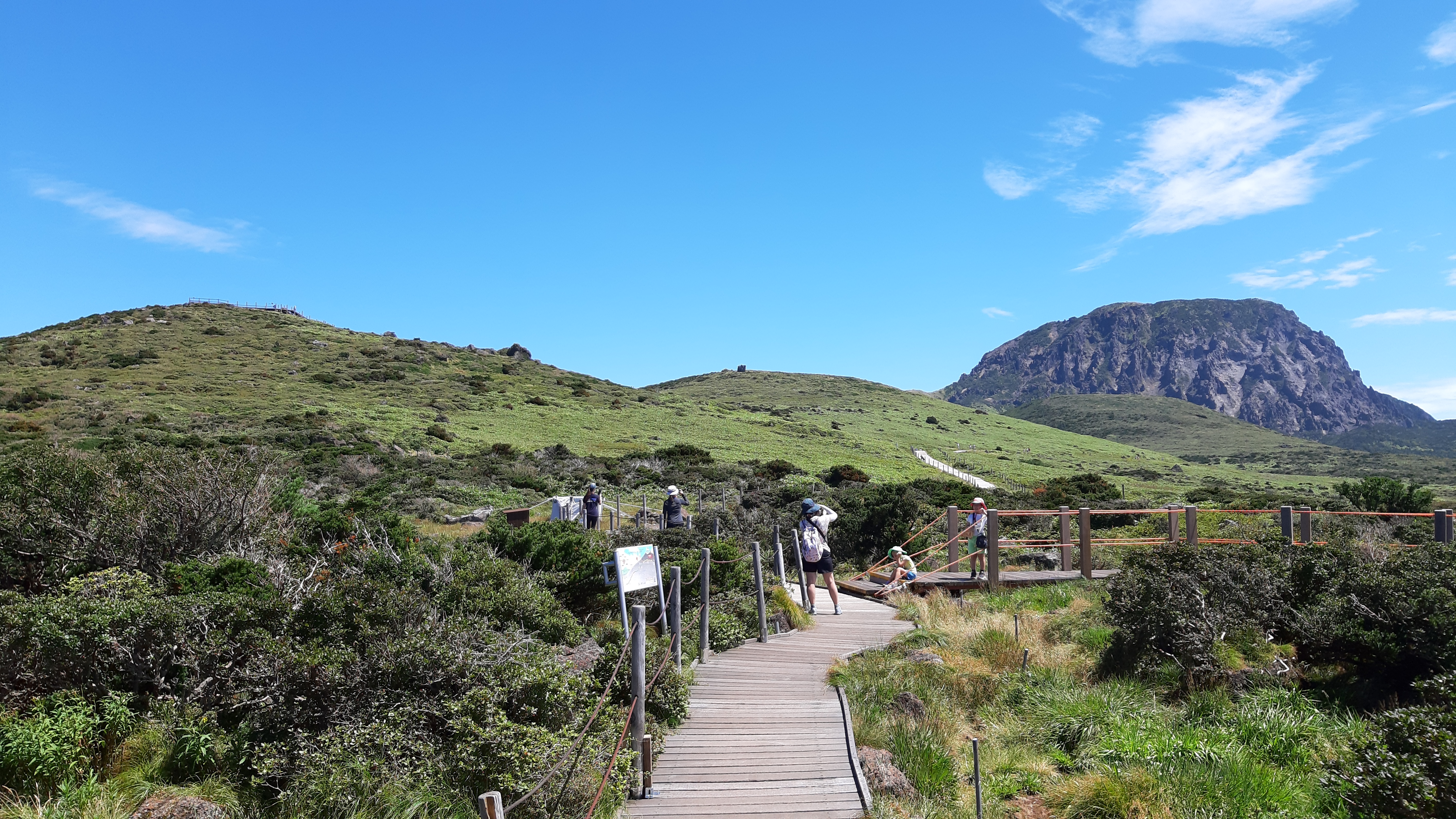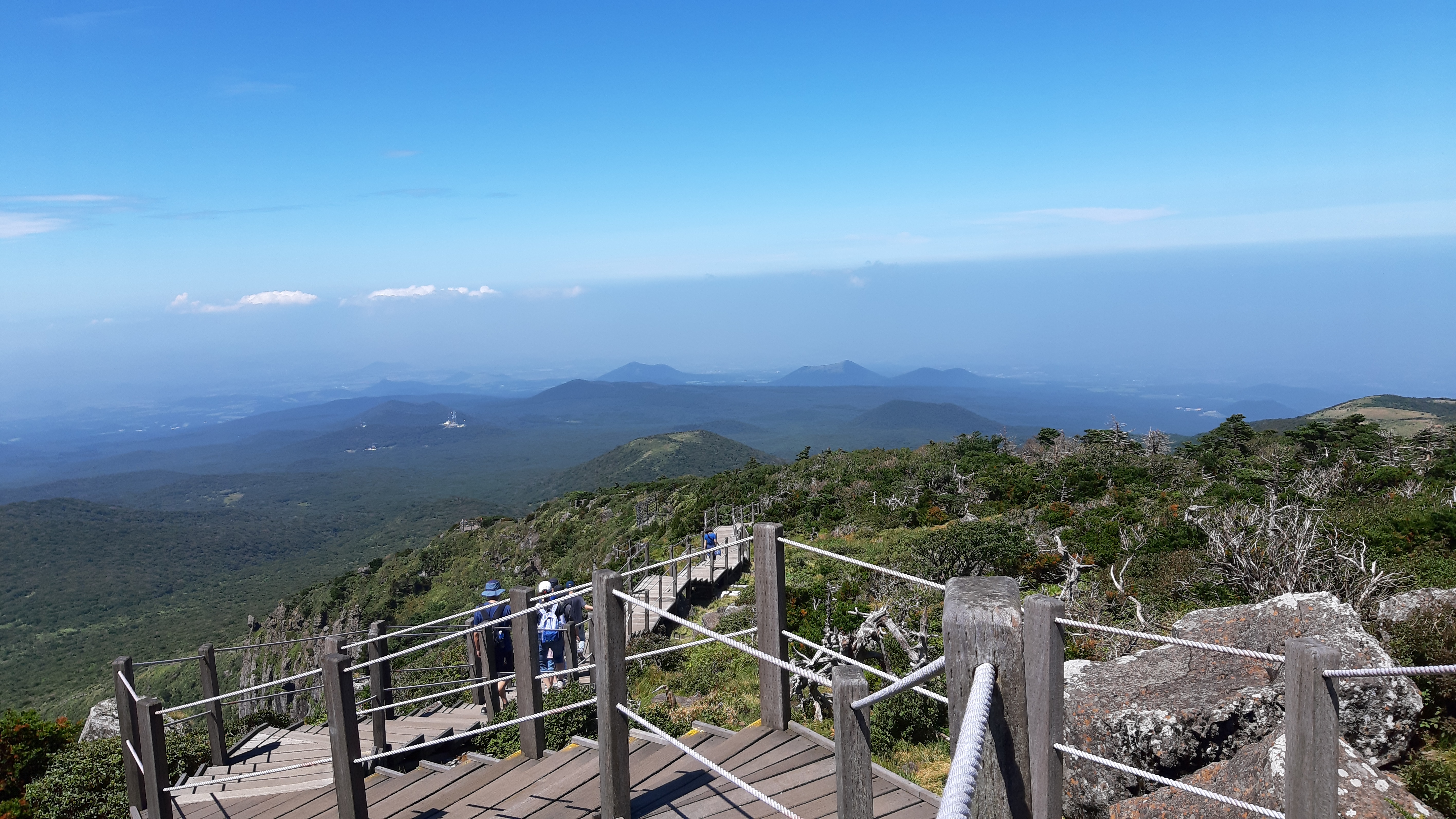 한라산은 한국에서 제일 높은 산인데 어제 영실길로 윗세족은오름까지 올랐다. 거기서 한라산꼭대기와 제주 서쪽을 잘 볼 수 있다. 그 길은 한국의 전형적인 길로 가파른 구간은 계단으로 지어졌다.